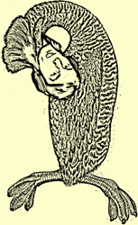 Rose-Bottomed Nik-Nick: Perhaps the rarest of all birds and hard to completely understand. Strong paternal instincts keep him close to the nest though he is occasionally found at sunset bathing in a puddle, chirping his tell tale song. "fri-SELL, fri-SELL